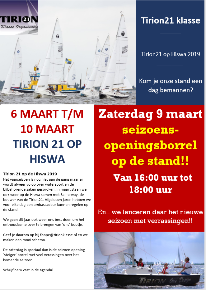 Tirion 21 op de Hiswa 2019 Het vaarseizoen is nog niet aan de gang maar er wordt alweer volop over watersport en de bijbehorende zaken gesproken. In maart staan we ook weer op de Hiswa samen met Sail-a-way, de bouwer van de Tirion21. Afgelopen jaren hebben we voor elke dag een ambassadeur kunnen regelen op de stand. We gaan dit jaar ook weer ons best doen om het enthousiasme over te brengen van ‘ons’ bootje. Geef je daarom op bij Dit e-mailadres wordt beveiligd tegen spambots. JavaScript dient ingeschakeld te zijn om het te bekijken. en we maken een mooi schema. De zaterdag is speciaal dan is de seizoen opening ‘steiger’ borrel met veel verassingen over het komende seizoen! Schrijf hem vast in de agenda!