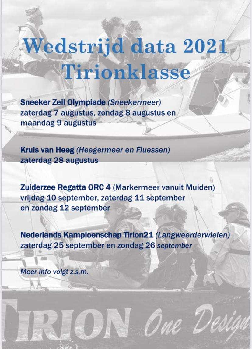 Een mooi vervolg op deze zijn de komende wedstrijden welke we noemen hieronder. We gaan ons uiterste best doen om weer zoveel mogelijk schepen te laten meedoen. Net begonnen maar graag willen zeilen is voor ons een goede gedachte. Meld je daarom ook aan als je geen boot hebt maar wel wilt meemaken hoe leuk het is om op een Tirion21 te zeilen. We hebben een eigen klasse boot welke we in kunnen zetten. Bij de Tirion21 klasse is het sociale ook zeer belangrijk. We zien dat graag terug op de wedstrijden waar we altijd wel een leuk evenement organiseren met de groep. Trek jij nu ook eens de stoute schoenen aan?