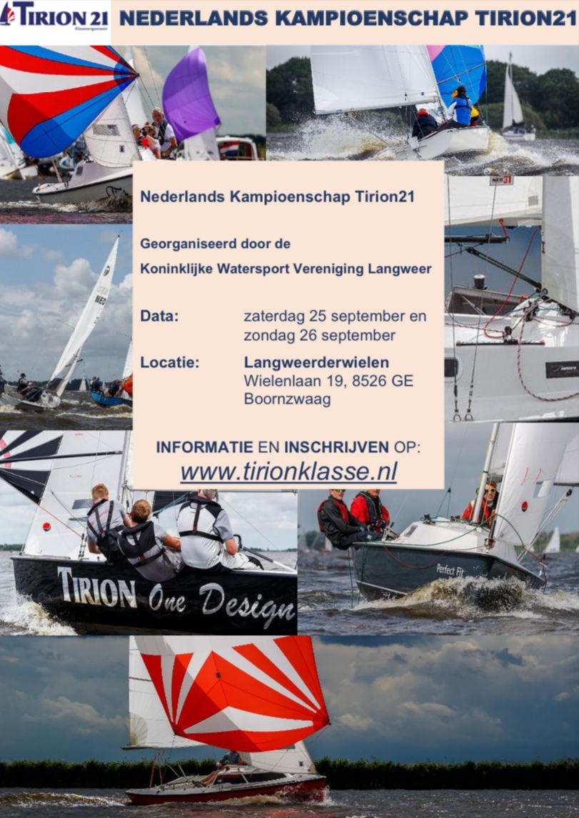Op zaterdag 25 september en zondag 26 september 2021 wordt het NK Tirion 2021 verzeild. Net zoals de 2 voorgaande edities wordt het NK op de Langeweerderwielen door Koninklijke Watersport Vereniging Langweer georganiseerd. Op de zaterdag worden er 4 wedstrijden verzeild en op de zondag 2. Zie voor meer informatie de wedstrijd aankondiging, hieronder in de link te vinden. Het programma ziet er als volgt uit: